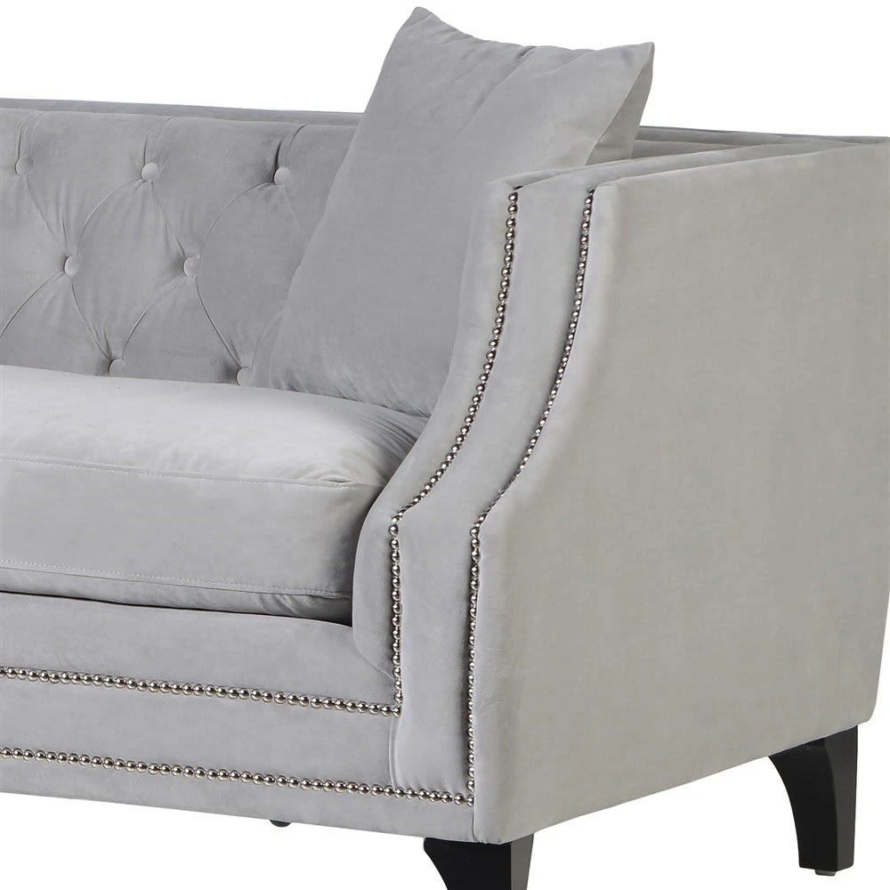 Add a touch of luxe to your home with this marvellous sofa! The luscious, grey sofa comes with sumptuous, deep-buttoning and silver studding. This piece comes with two seat cushions and two complimentary cushions for added comfort.