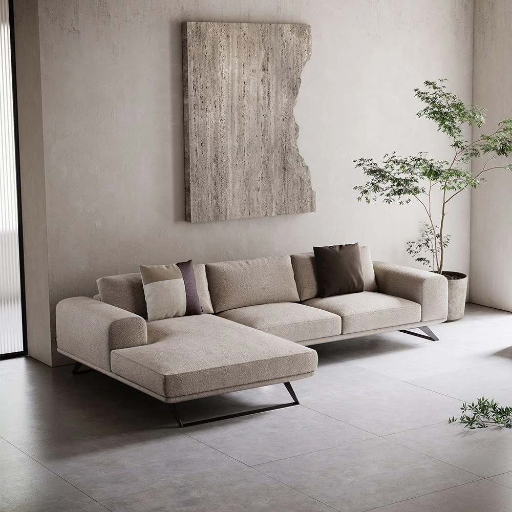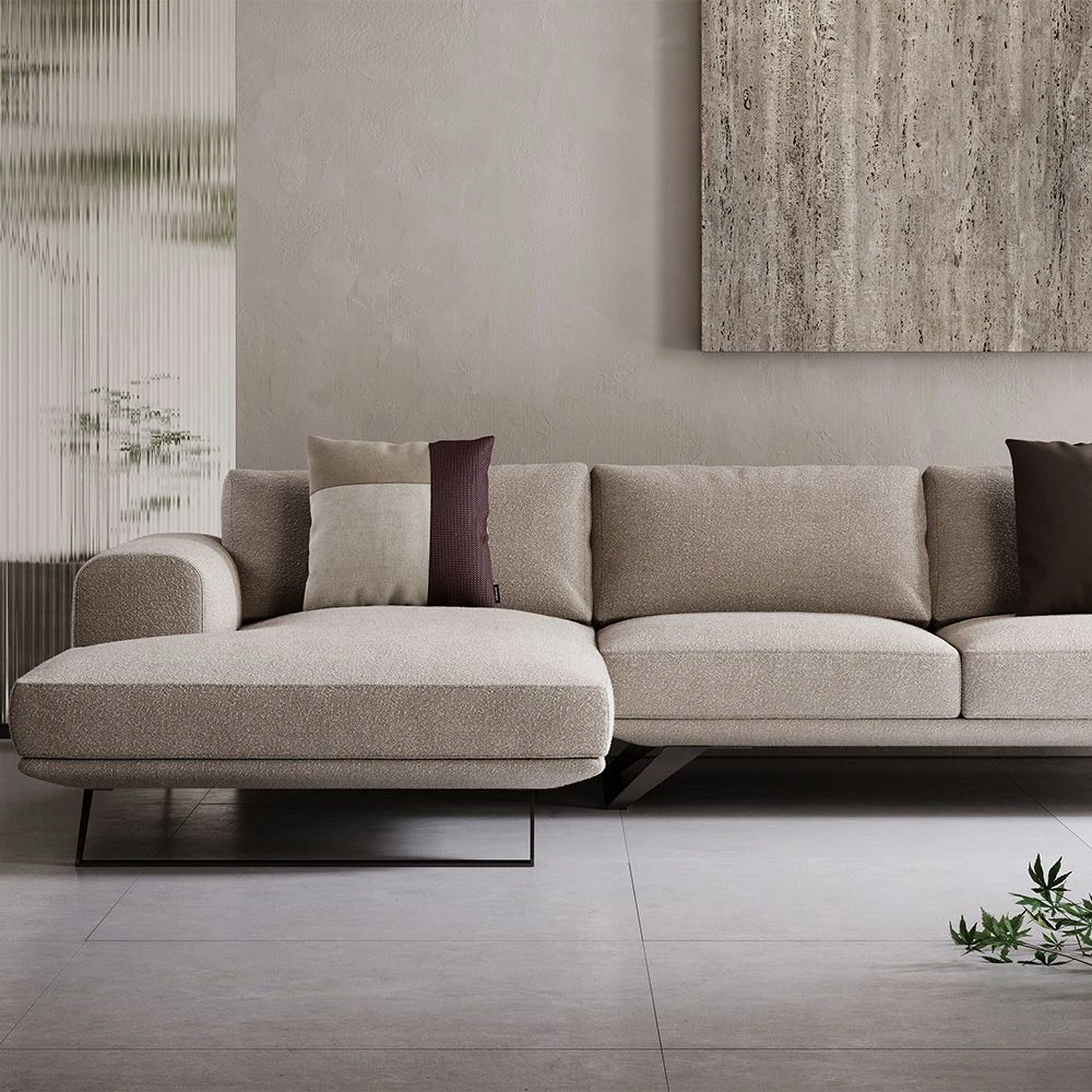 Add a touch of drama and modernity to your home with the Aniston Chaise Longue Sofa by Domkapa. The sofa is featured in a luxurious boucle fabric, finished with smoky black polished legs which complete the industrial-inspired design and make this piece perfect for any contemporary living space.