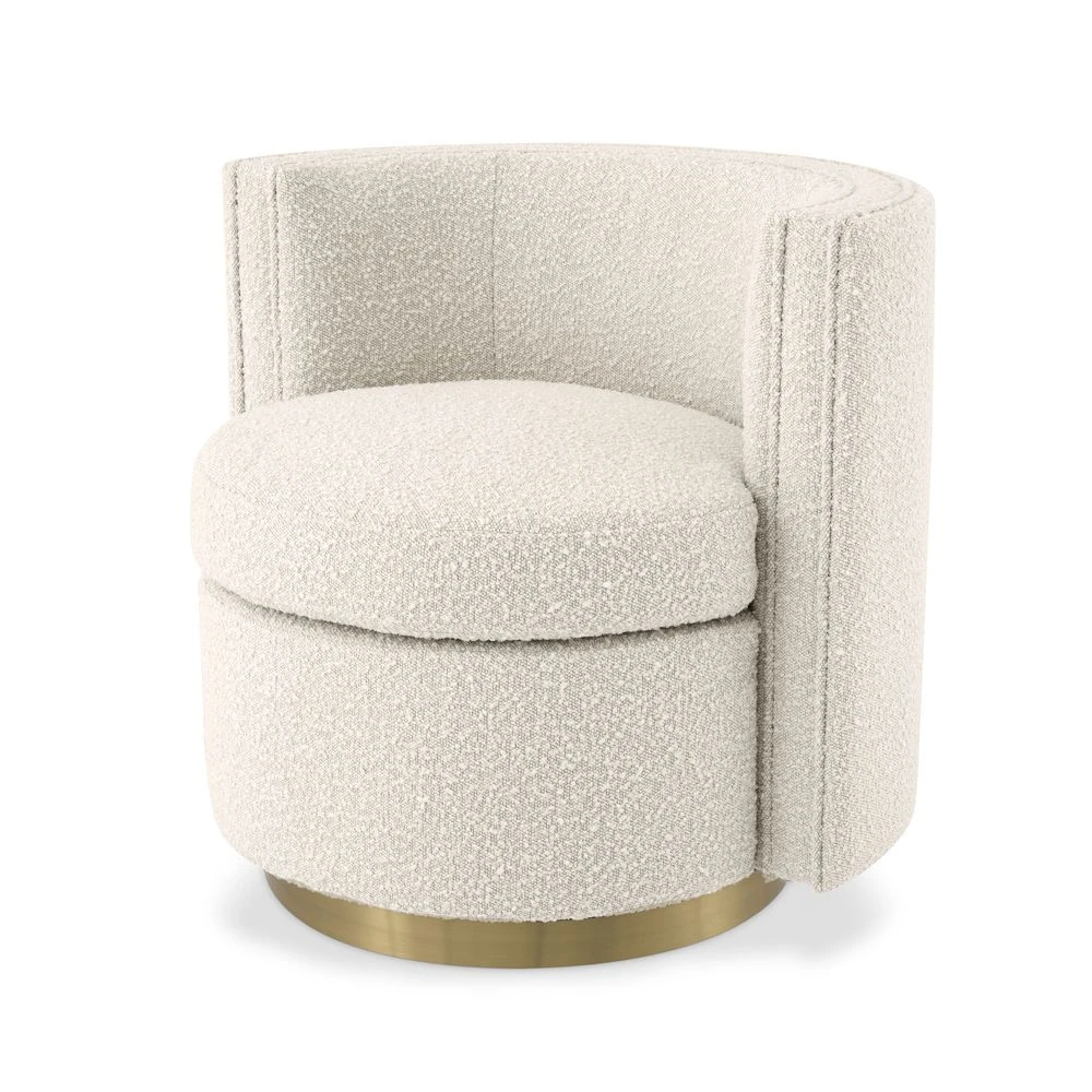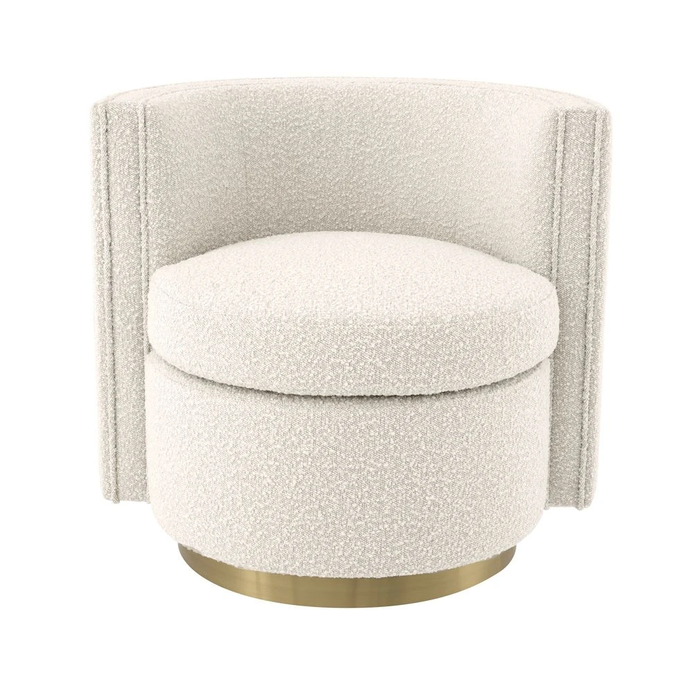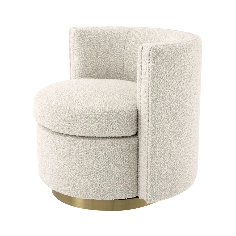 Upholstered in a luxurious, boucle cream fabric, the Amanda Swivel Chair is a fabulous accent seat for making a glamorous, contemporary space feel complete. It boasts a stylish silhouette and a swivel base with a polished brass finish for an added touch of elegance.