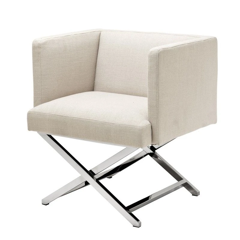 A classic upright lounge chair with crossover base and a black Panama fabric finish. The Dawson chair from Eichholtz is the epitome of class, and effortless sophistication and infinite style. The natural comfort and design make it perfect and easy o pair with almost any interior. A stainless steel base complements the chair is holds.