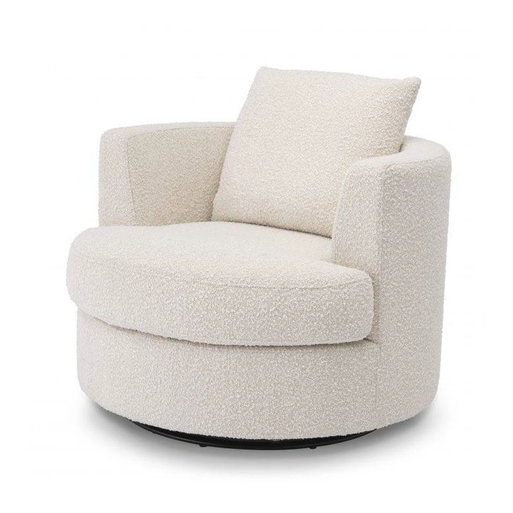 The Felix Swivel Chair is the accent chair of dreams! Boasting a cosy, enveloping tub-style silhouette, this richly-cushioned armchair is upholstered in a sumptuous boucle fabric mounted on a black swivel base.