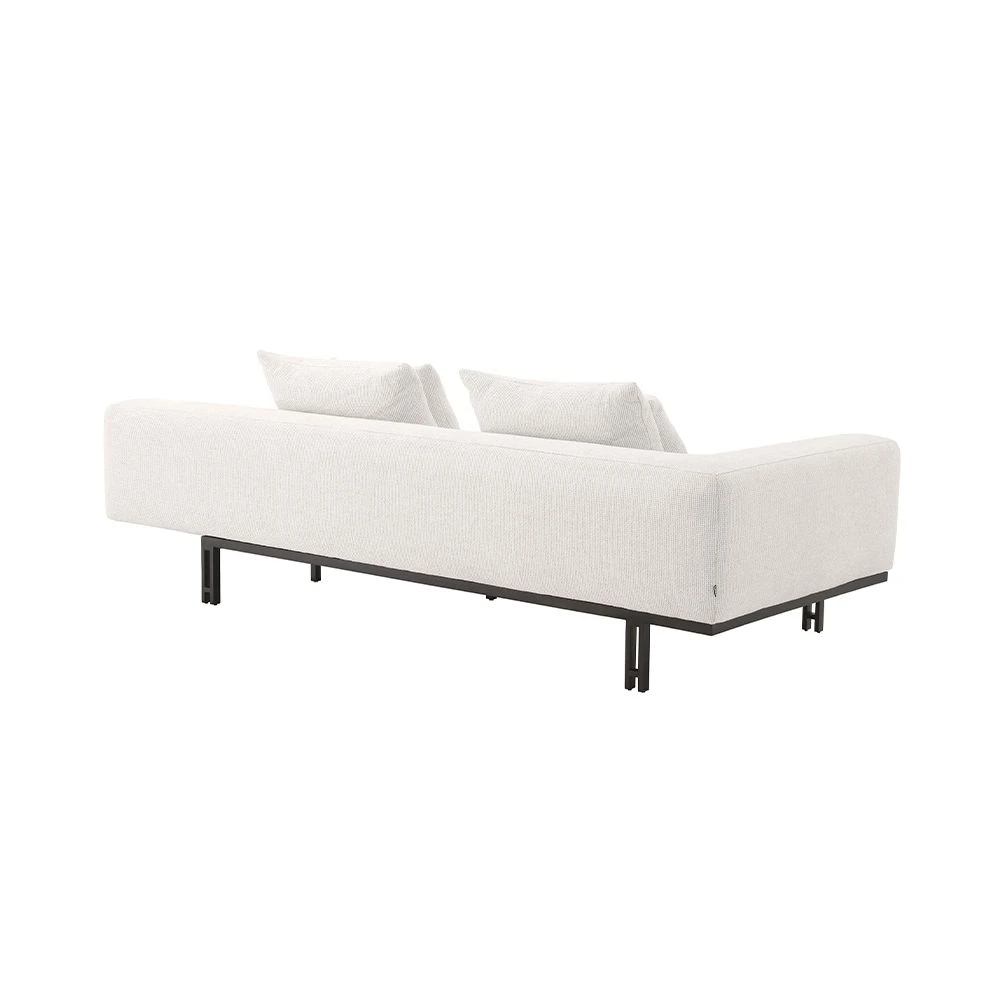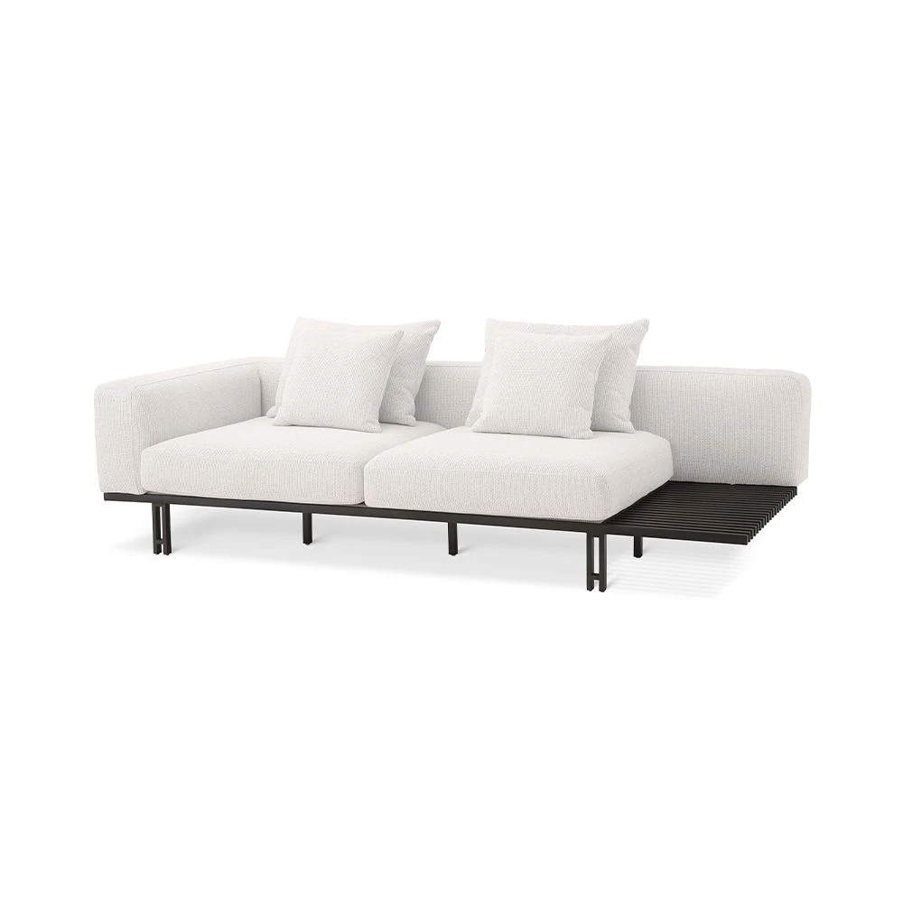 Transform your living space with this fabulous statement sofa by Eichholtz. This sumptuous two-seater sofa exudes modern luxury with its off-white upholstery and solid bronze finish base that will complement modern, contemporary and industrial interiors wonderfully. This functional piece is completed with an integrated side table with a slatted top and comes with two large and two small throw cushions.