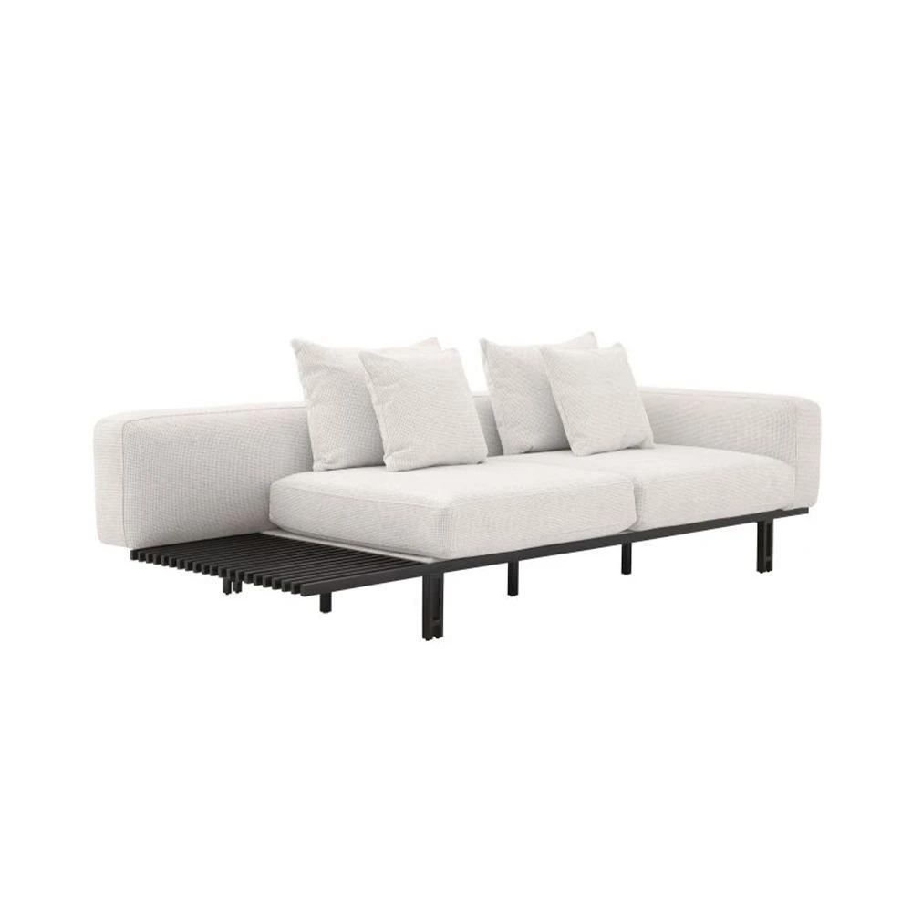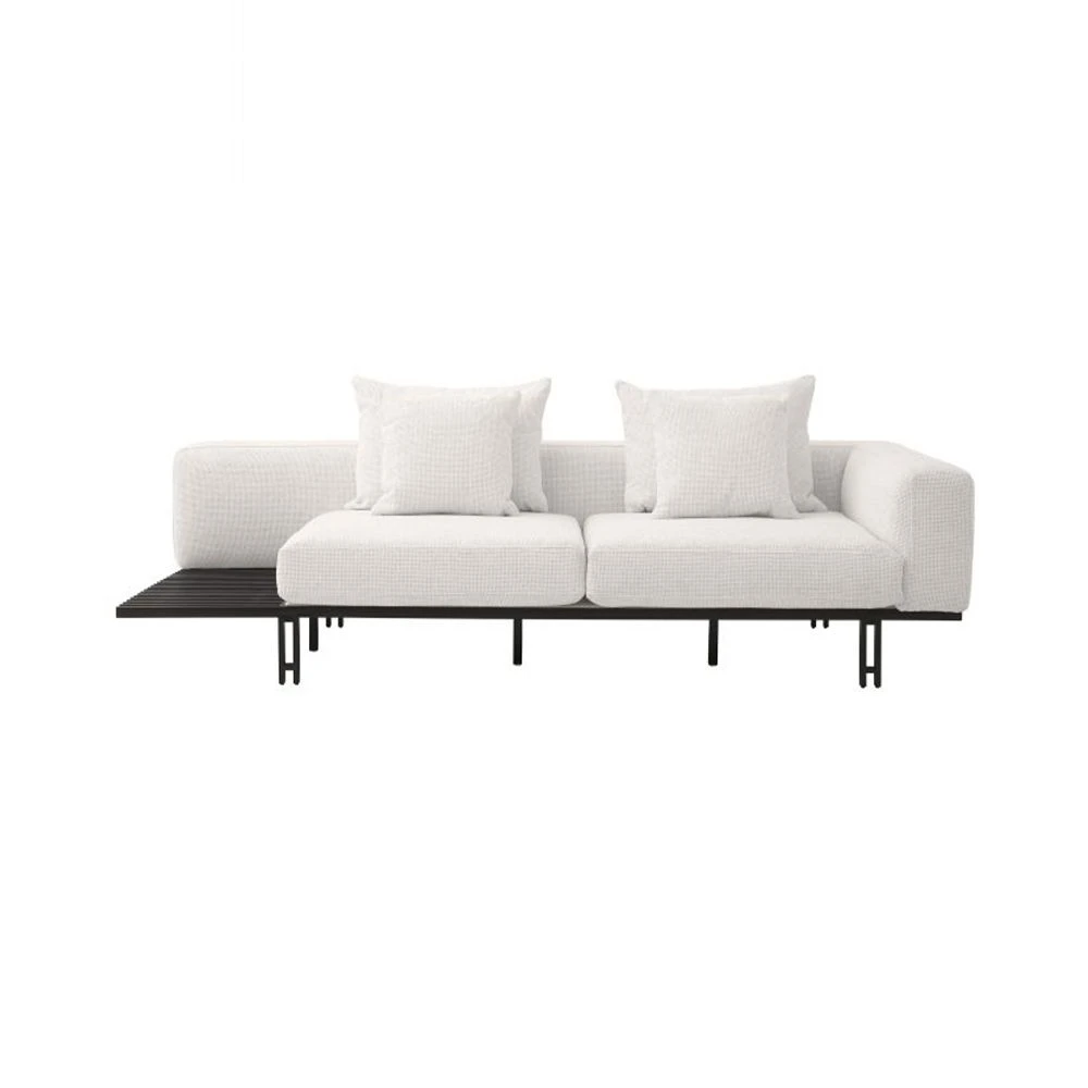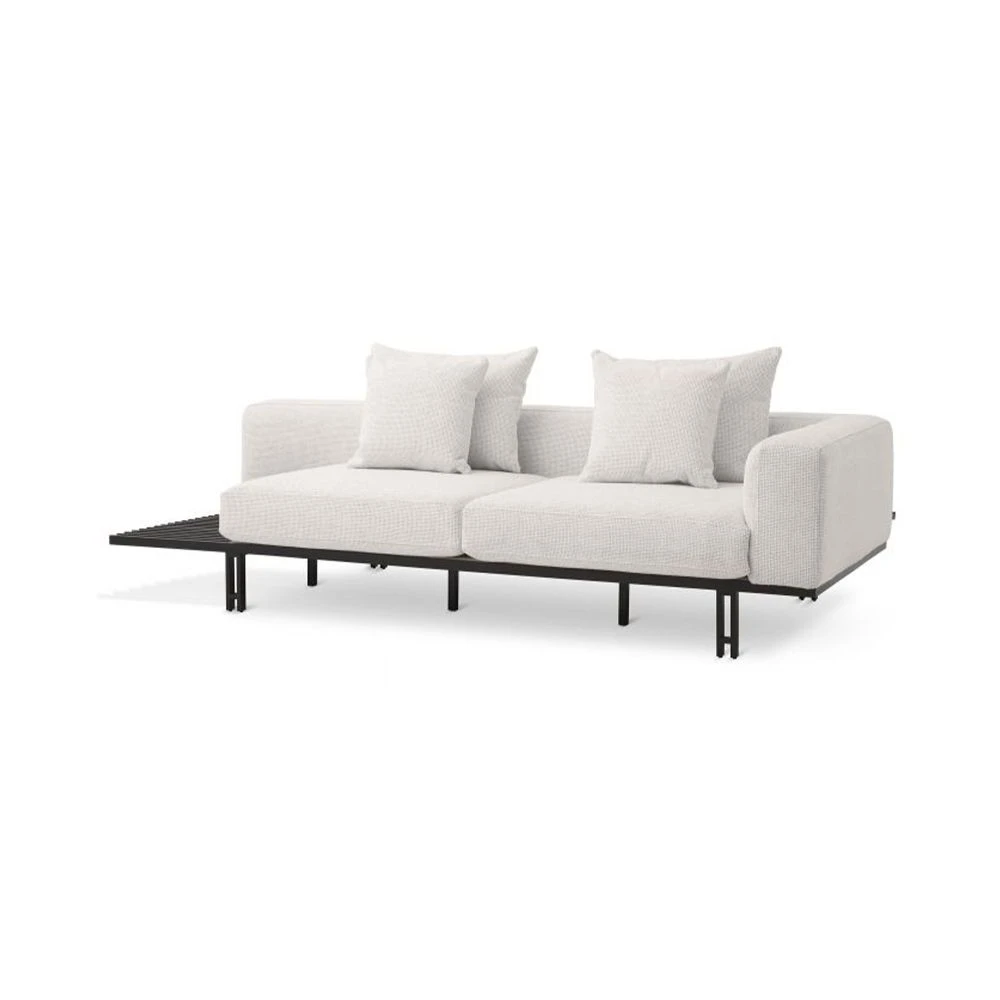 This sumptuous sofa is a modern masterpiece that will instantly transform any interior space. This statement sofa exudes the utmost luxury with its contemporary design, featuring a gorgeous off-white upholstery and solid bronze finished base. Complete with a slatted top which doubles up as an integrated side table and four throw cushions, this beautiful piece will make the perfect addition to any modern, contemporary or industrial interior.