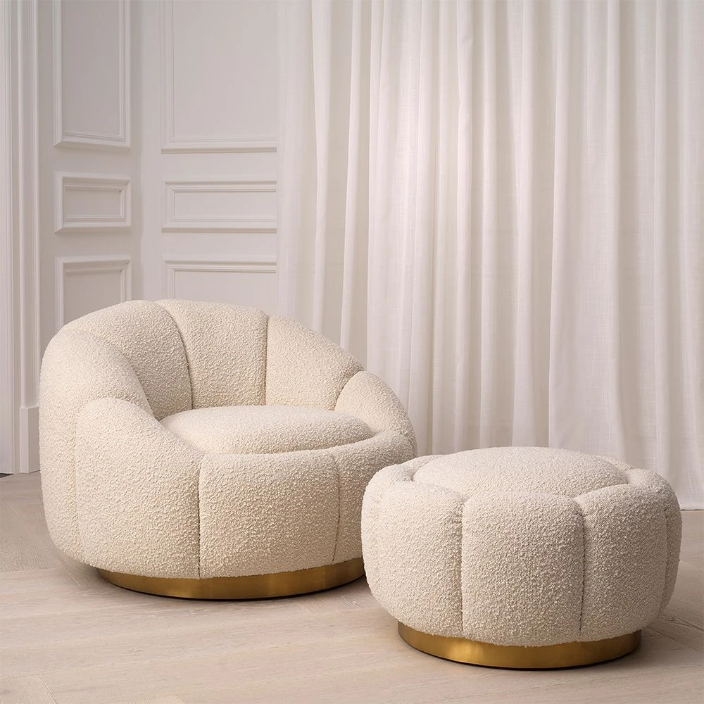 Inspired by retro designs, this fabulously sumptuous swivel chair is dressed in boucle cream-coloured upholstery and elevated by a brushed brass swivel base. It makes an excellent accent seat for a cosy but chic setting.