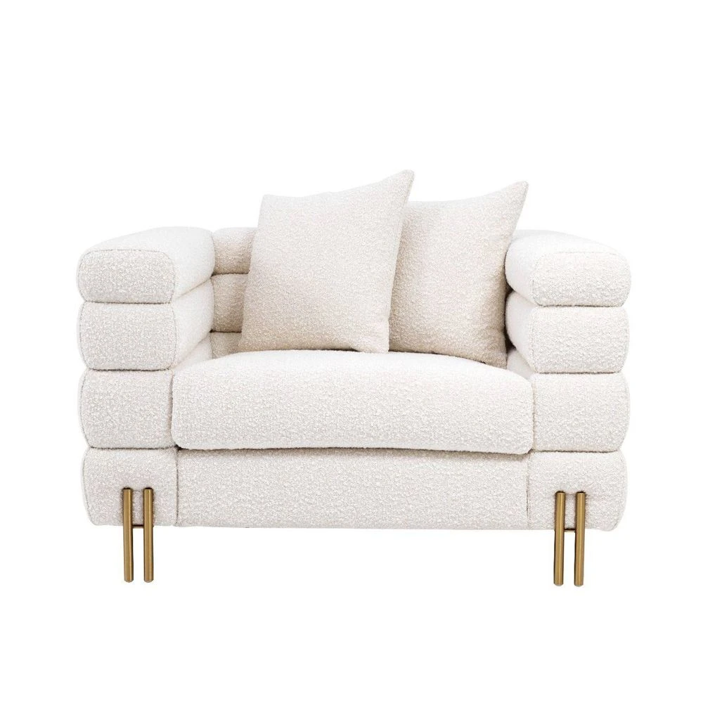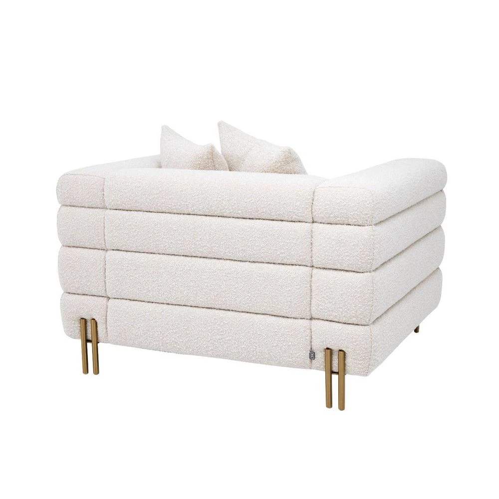 The gorgeous, contemporary York Armchair exudes endless elegance with rich, Art-deco undertones. The stylish silhouette upholstered in bouclé cream, savona grey velvet or mademoiselle beige fabric is a fabulous addition to any contemporary living room or bedroom. The cream upholstery combined with the luxurious golden feet creates a design that is effortlessly attractive and stylish.