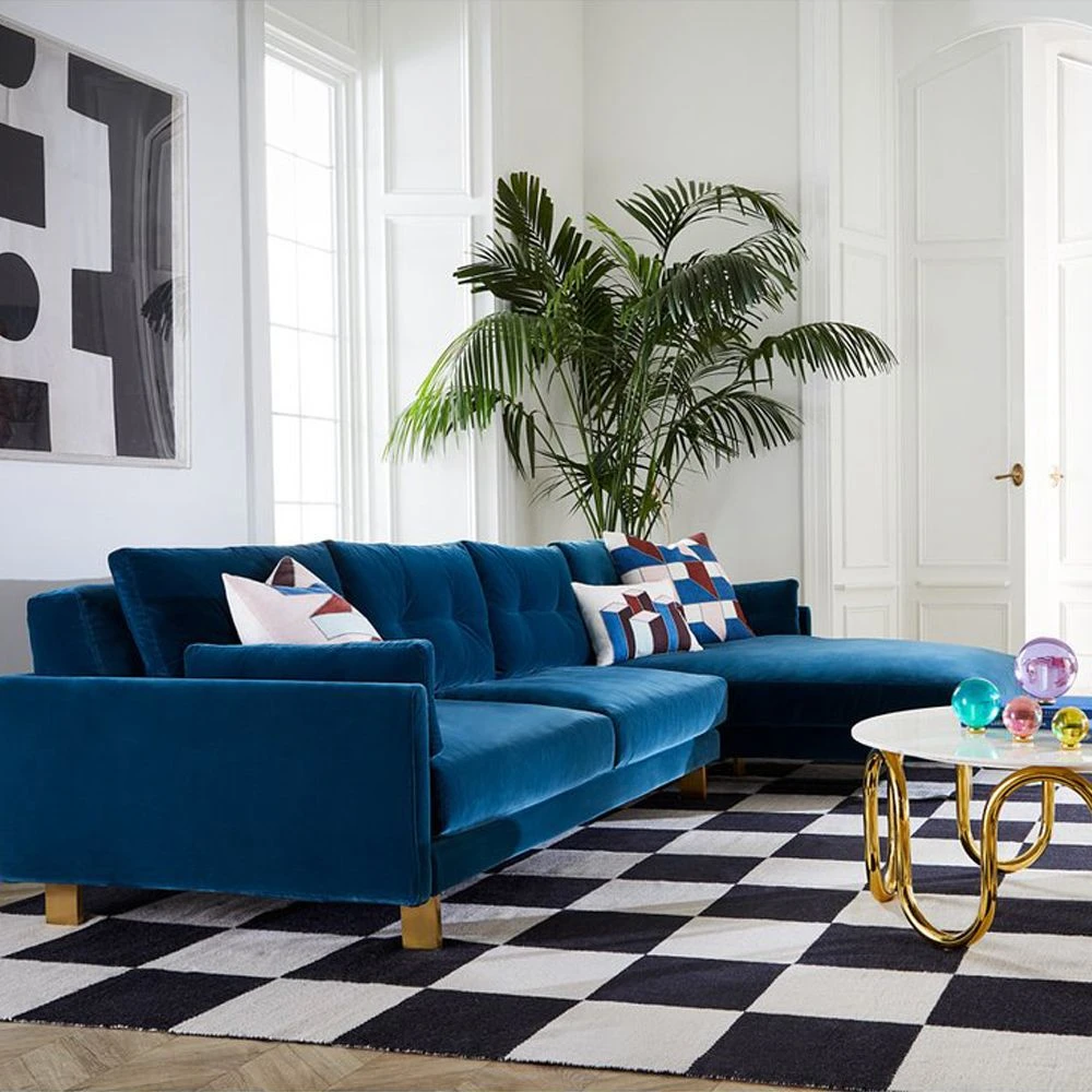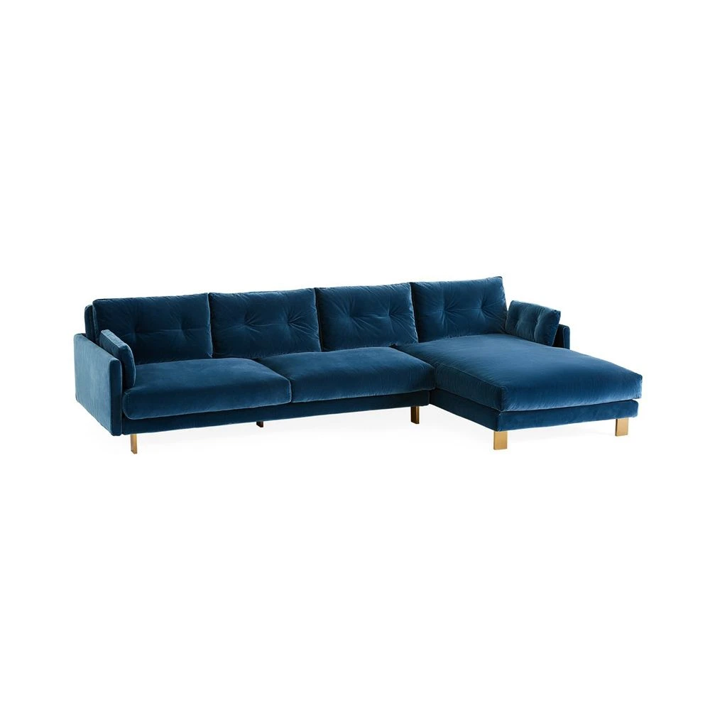 Enrich your living space with the chic, Malibu Sectional Sofa in this mesmerising, deep blue velvet upholstery. Supported by polished brass feet, this sofa is the epitome of understated glamorous and will suit any modern or contemporary setting. Left-hand facing available .