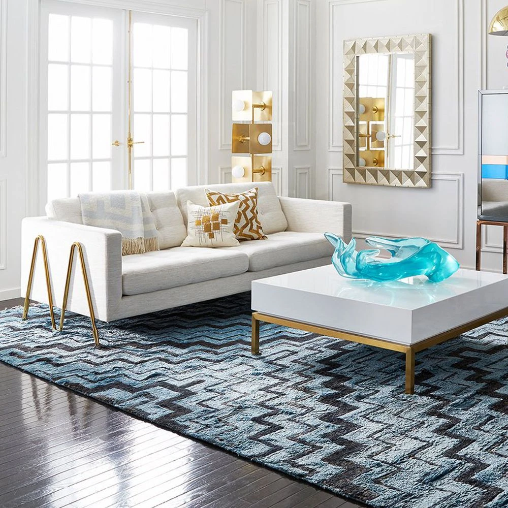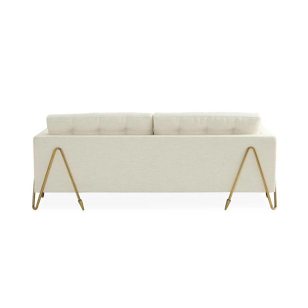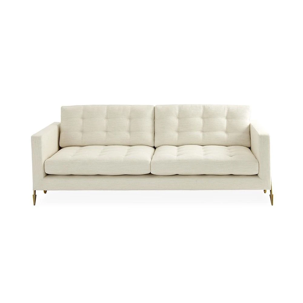 Effortlessly chic and elegant, the Maxime Sofa by Jonathan Adler hits all the right notes. The stylish brass legs support the sumptuous seat that features deep buttoning and lavish boucle upholstery.