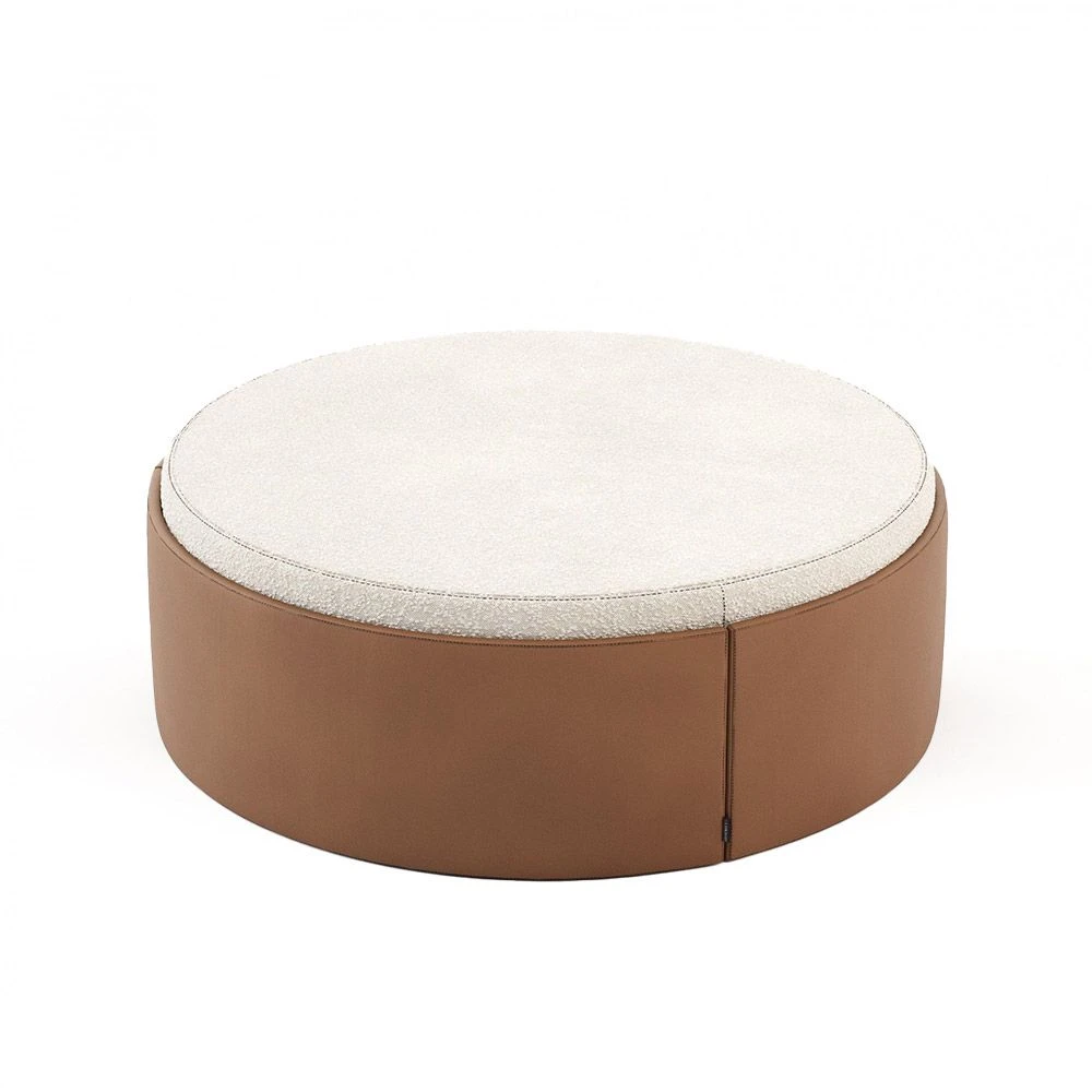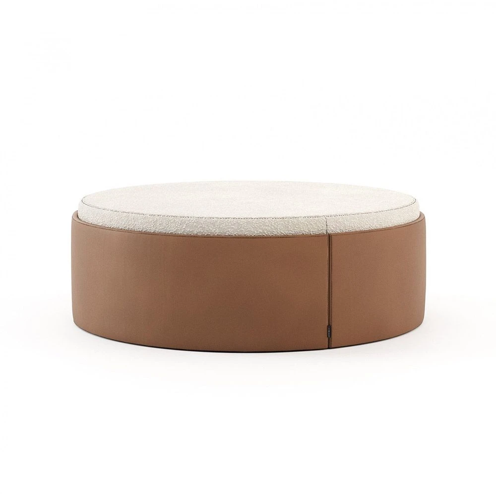Kick your feet up and relax with this impeccable Jason Pouf. This mid-century inspired design featured varying textures, including a luxurious boucle upholstered top and brown leather edge, making it an ultra-chic addition to any modern living space.