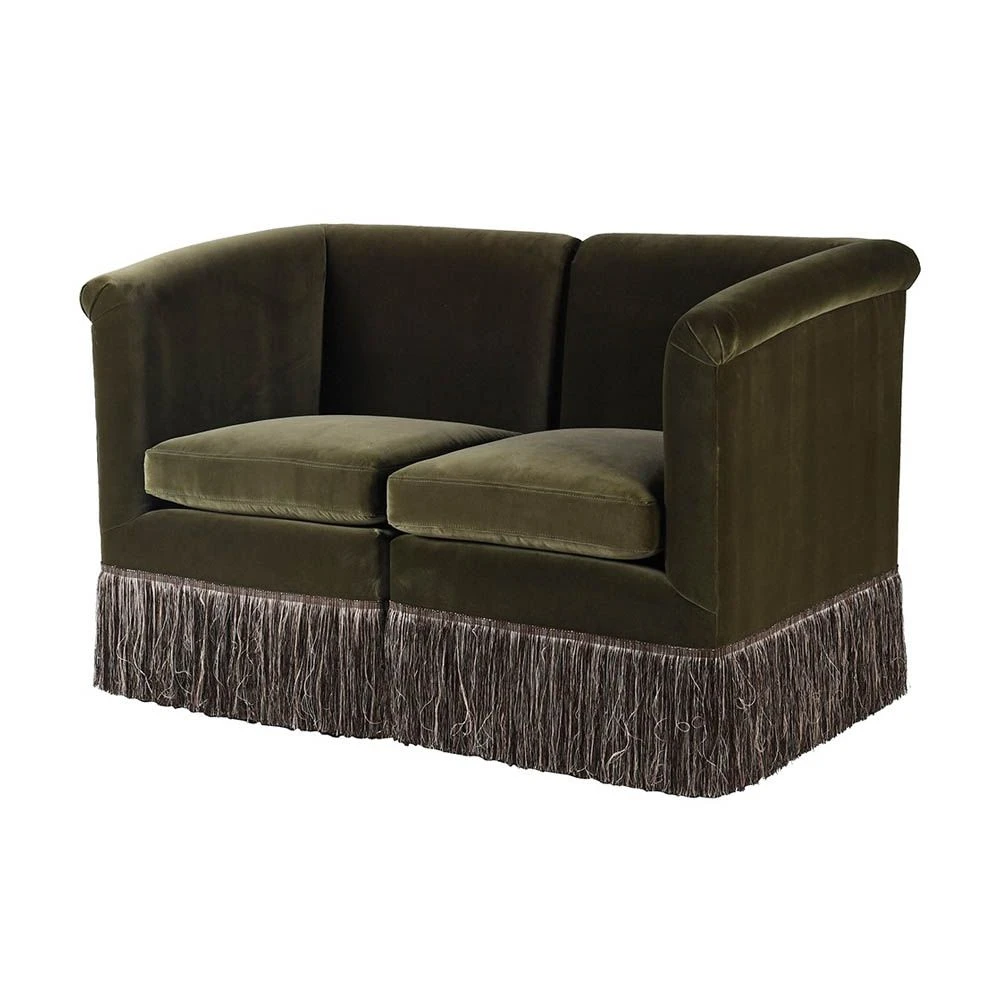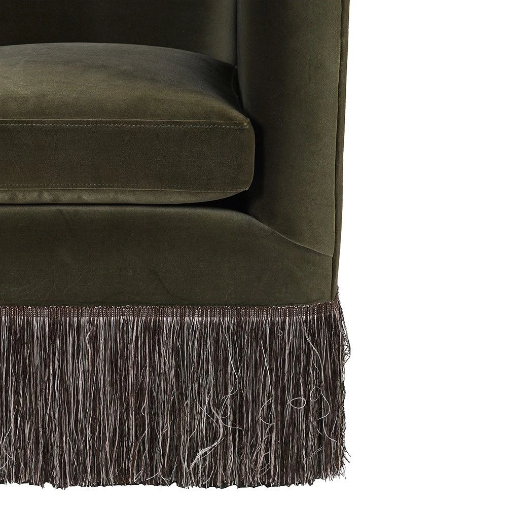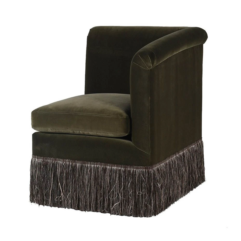 The Rapture Chair embraces decadent elegance, outfitted in a luxurious green velvet and framed in fringe. Pair with the Rapture Left to complete the Rapture Sofa Set and lounge in luxury.