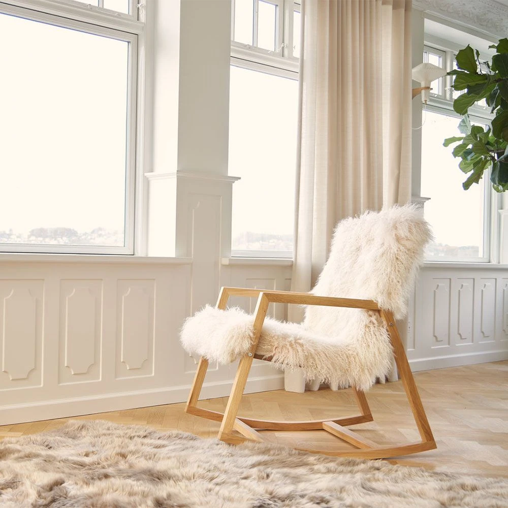 Adore the elegant charm of this ultra-cosy Sheepskin Rocking Chair. Influenced by Nordic design, this captivating piece will dress your space in enchanting hygge with its sheepskin wool seat cover and ash wood finish. This rocking chair is guaranteed to be your favourite snuggle spot.